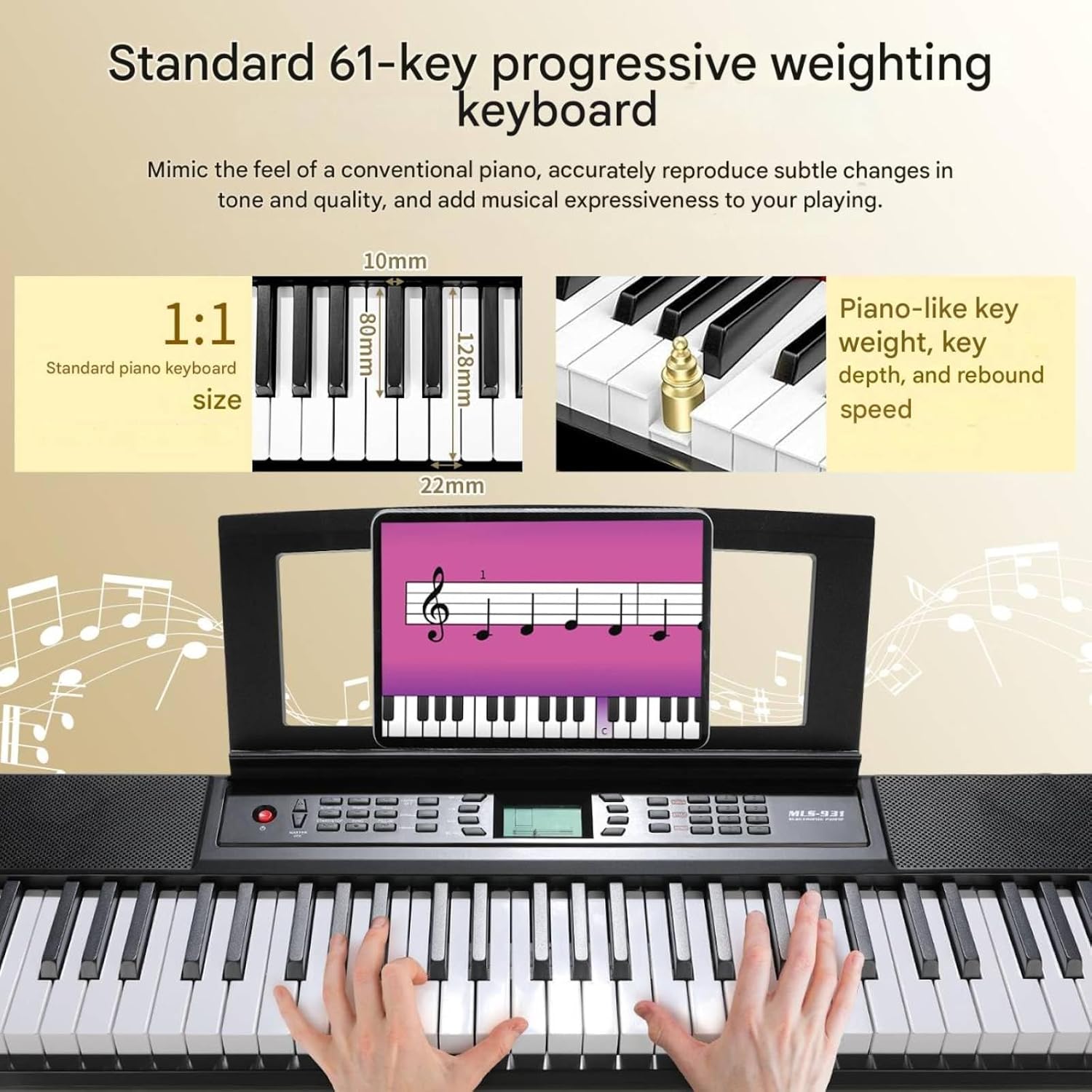 - بيانو قياسي بـ 61 مفتاحًا: مفاتيح البيانو القياسية بقياس 22 مم تُقدم لمسةً ممتازةً وإحساسًا احترافيًا. يجعل عزف البيانو الكبير الصوت أكثر واقعيةً وهدوءًا وثراءً. تتميز لوحة المفاتيح بـ 61 مفتاحًا حساسًا للمس، ويمكن لدرجات قوة اللمس المختلفة إحداث تغييرات طفيفة في جرس الصوت.