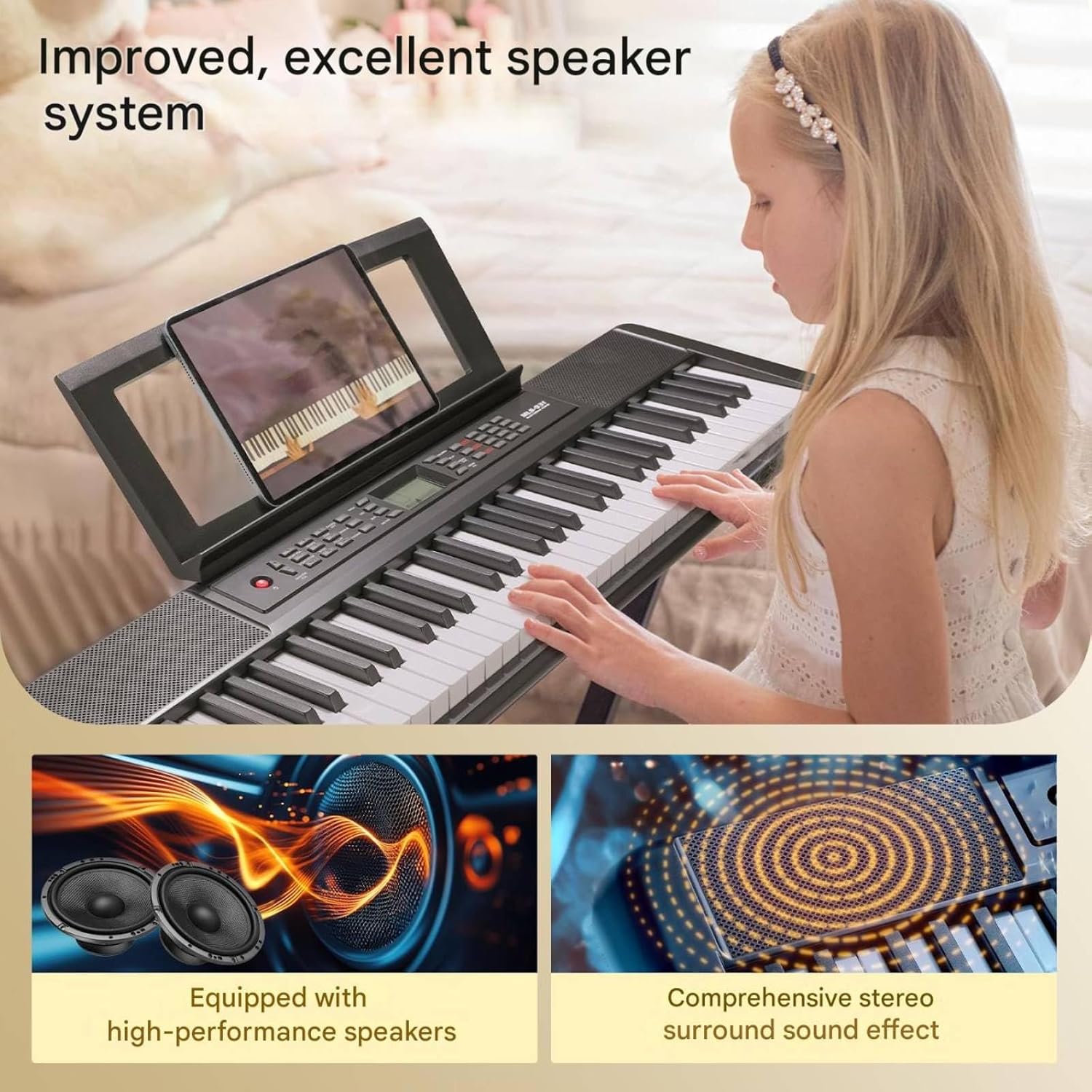 - Explore More Possibilities: 300 standard MID sounds, including acoustic piano, electric piano, strings, organ, synthesizer, drums, bass, and more, as well as 300 rhythms and 40 demo songs, are provided. With two built-in speakers, our portable keyboard piano offers a comfortable and authentic playing experience