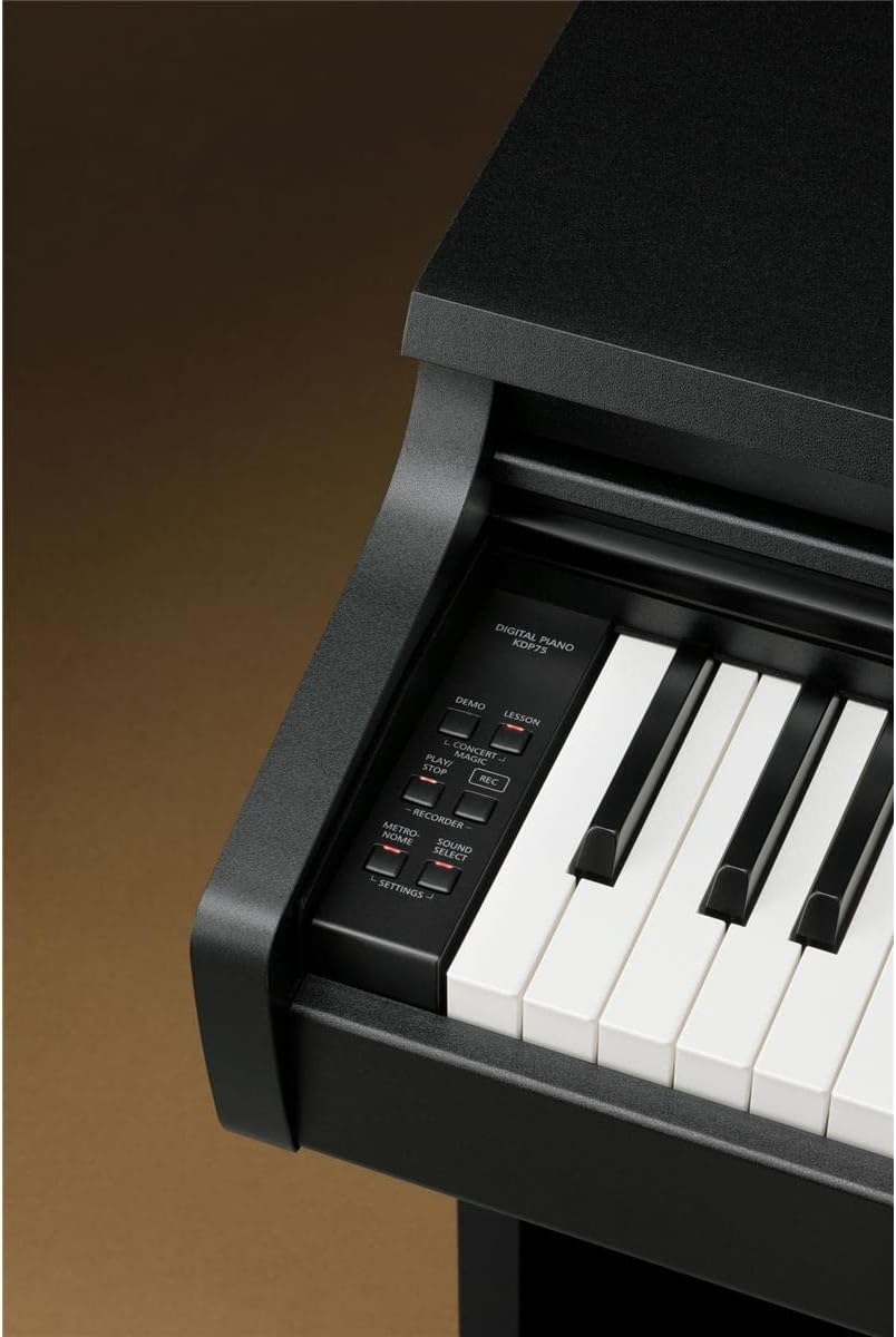 The KDP75 digital piano is the latest addition to Kawai’s highly-respected range of award-winning home instruments, combining an authentic weighted-key keyboard action and realistic grand piano sounds within an attractive, yet highly affordable package.